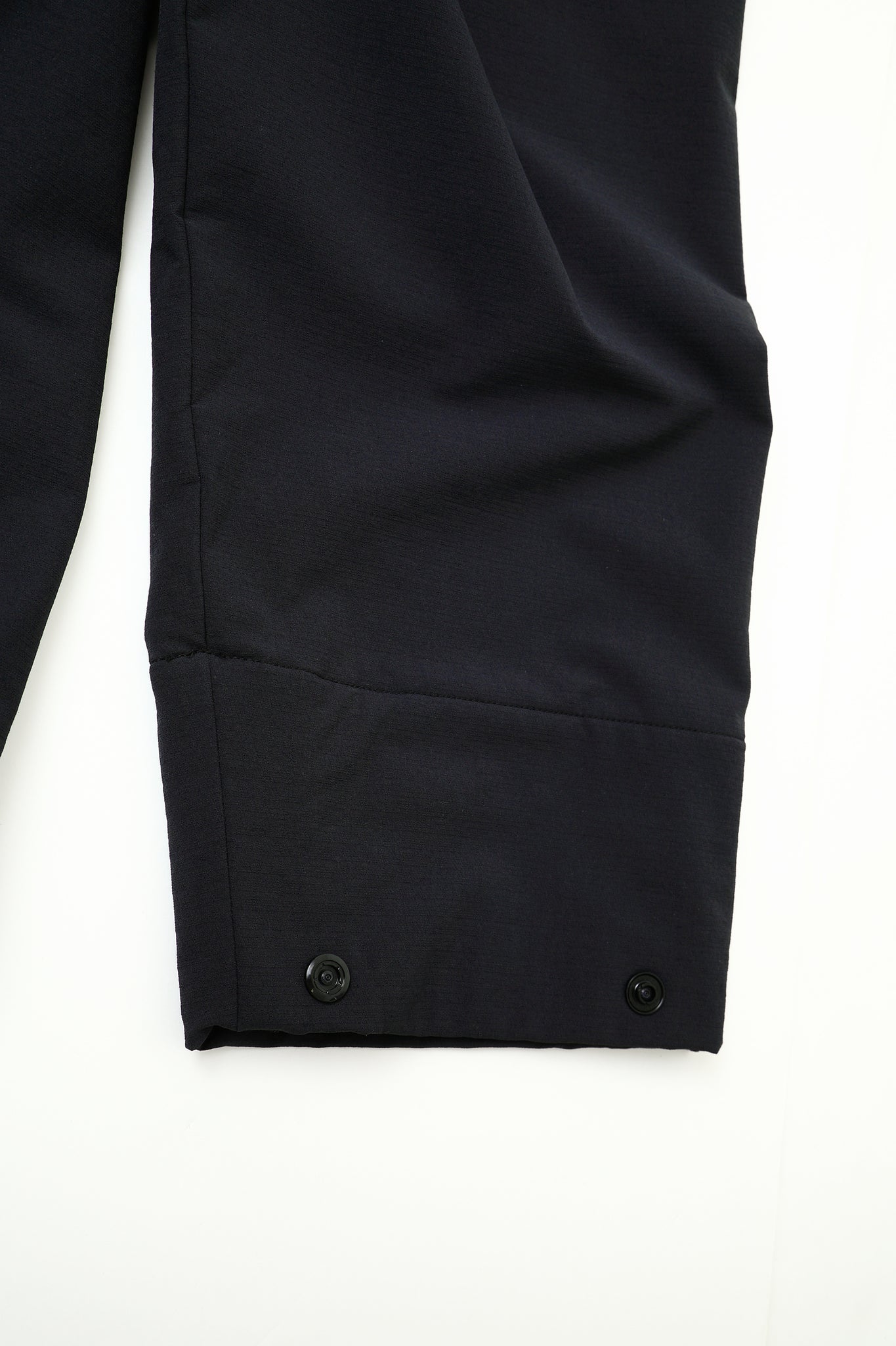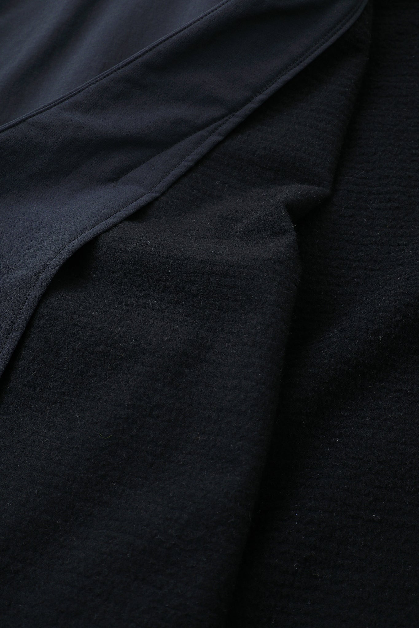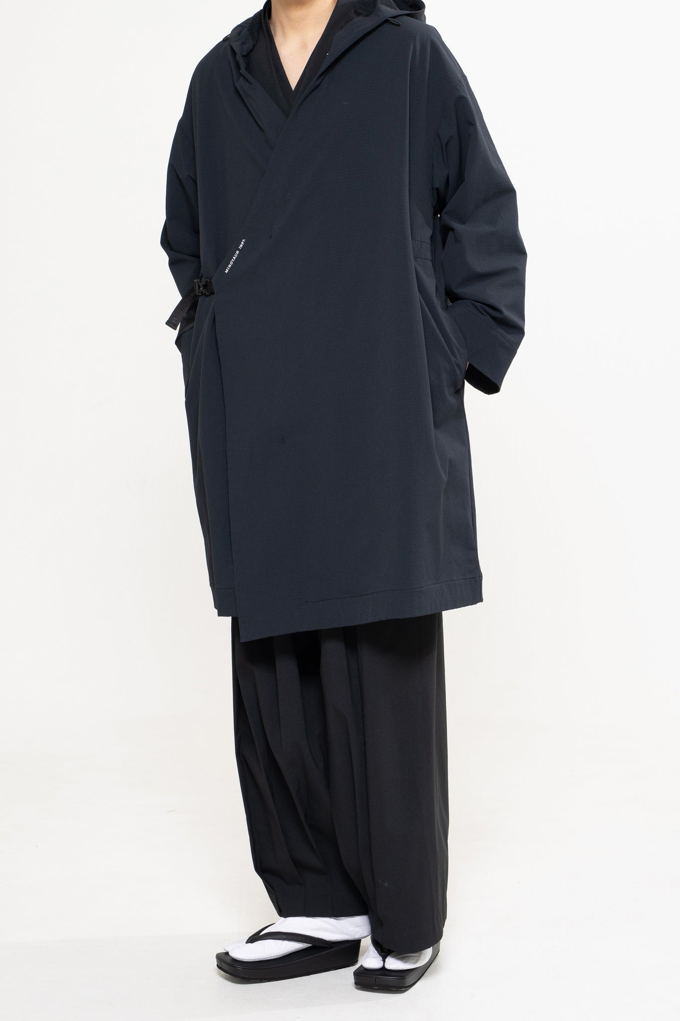 A lightweight Japanese modern coat made of functional material with excellent water repellency and stretchability.