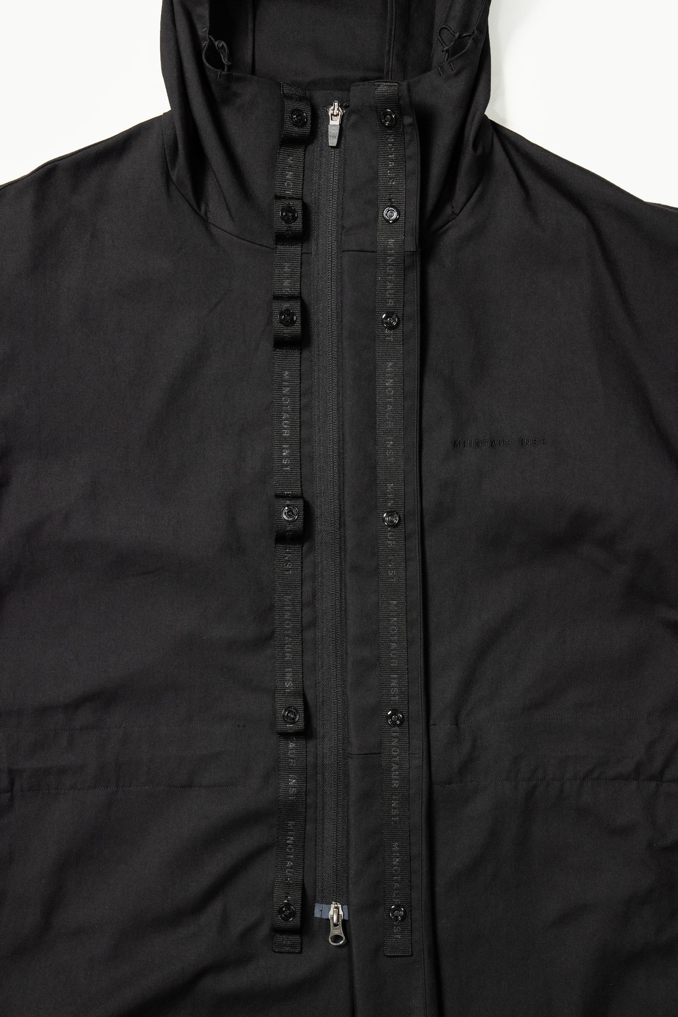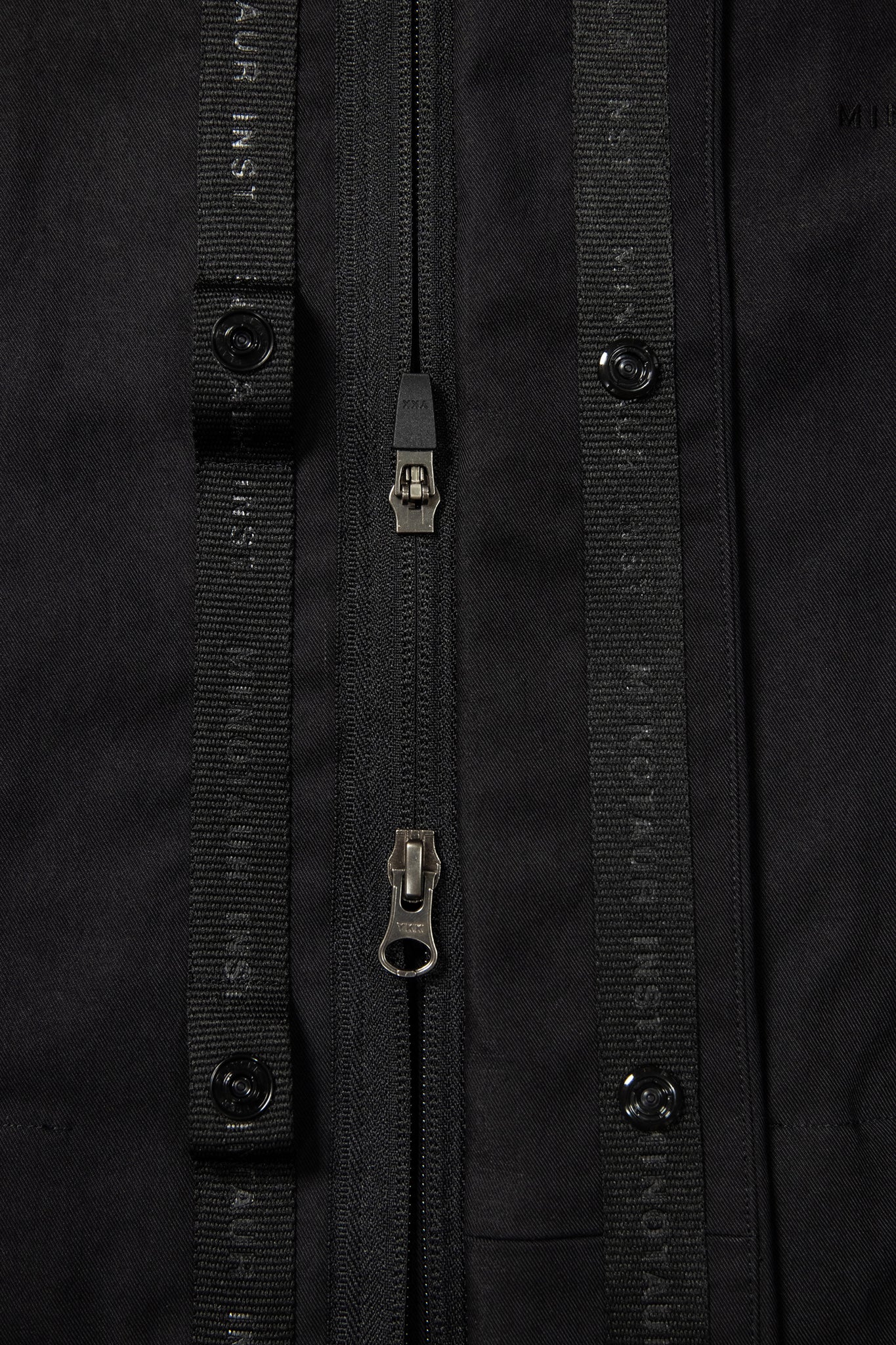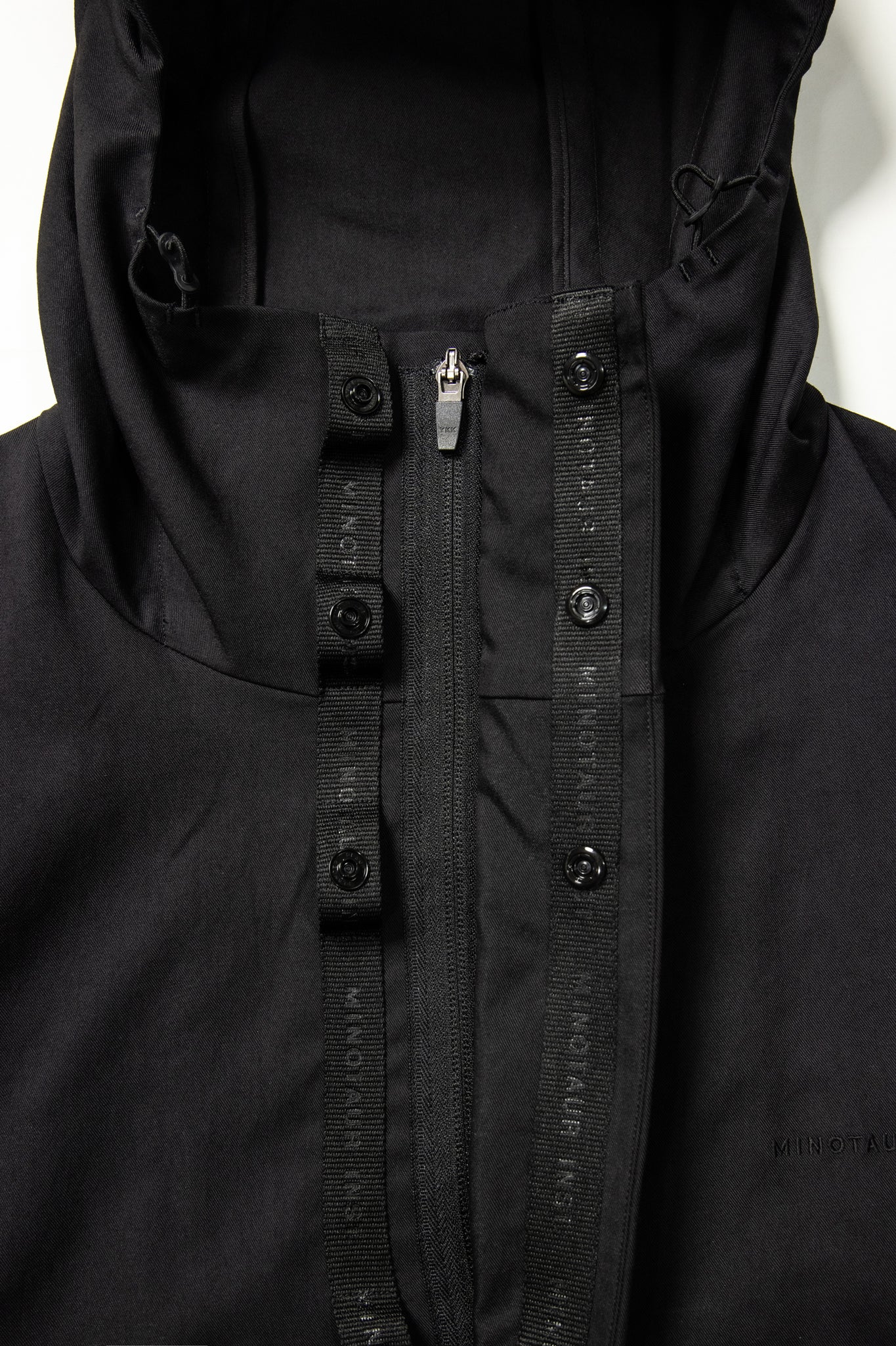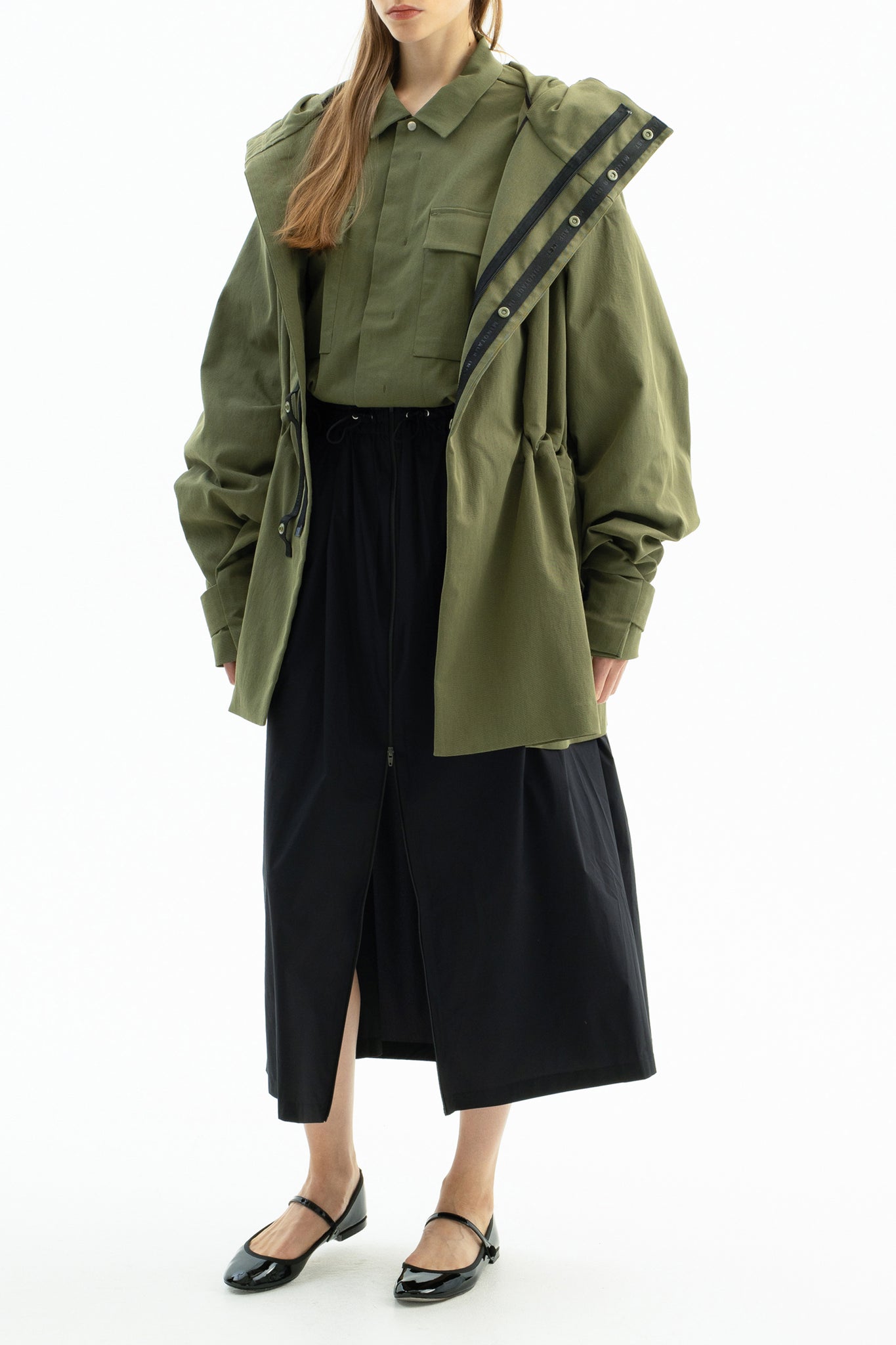 By utilizing technical materials, military elements are reinterpreted into a modern short coat.