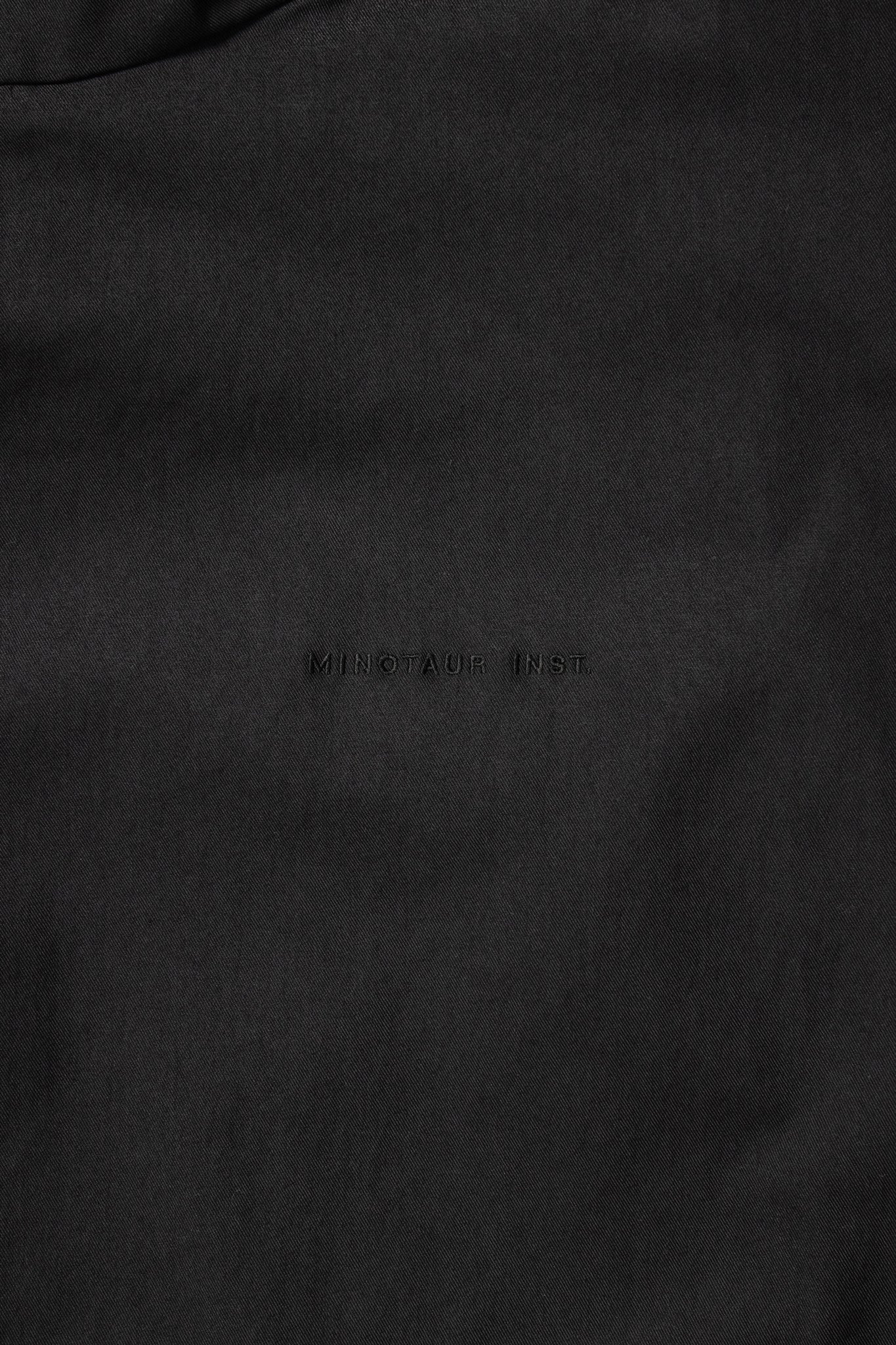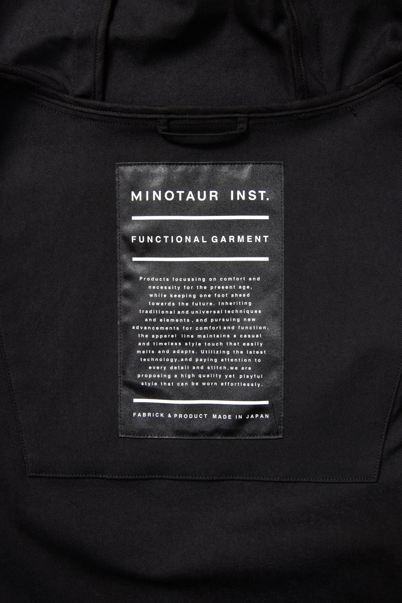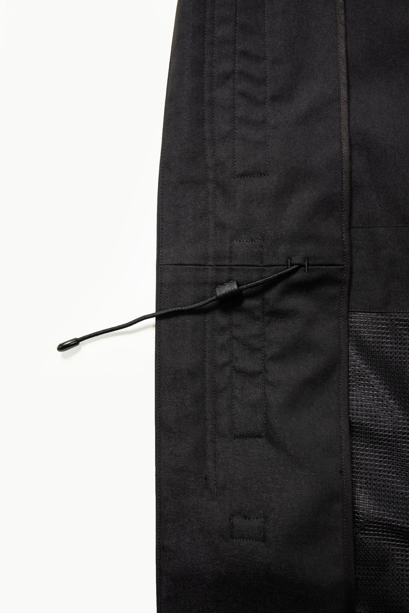 By utilizing technical materials, military elements are reinterpreted into a modern short coat.