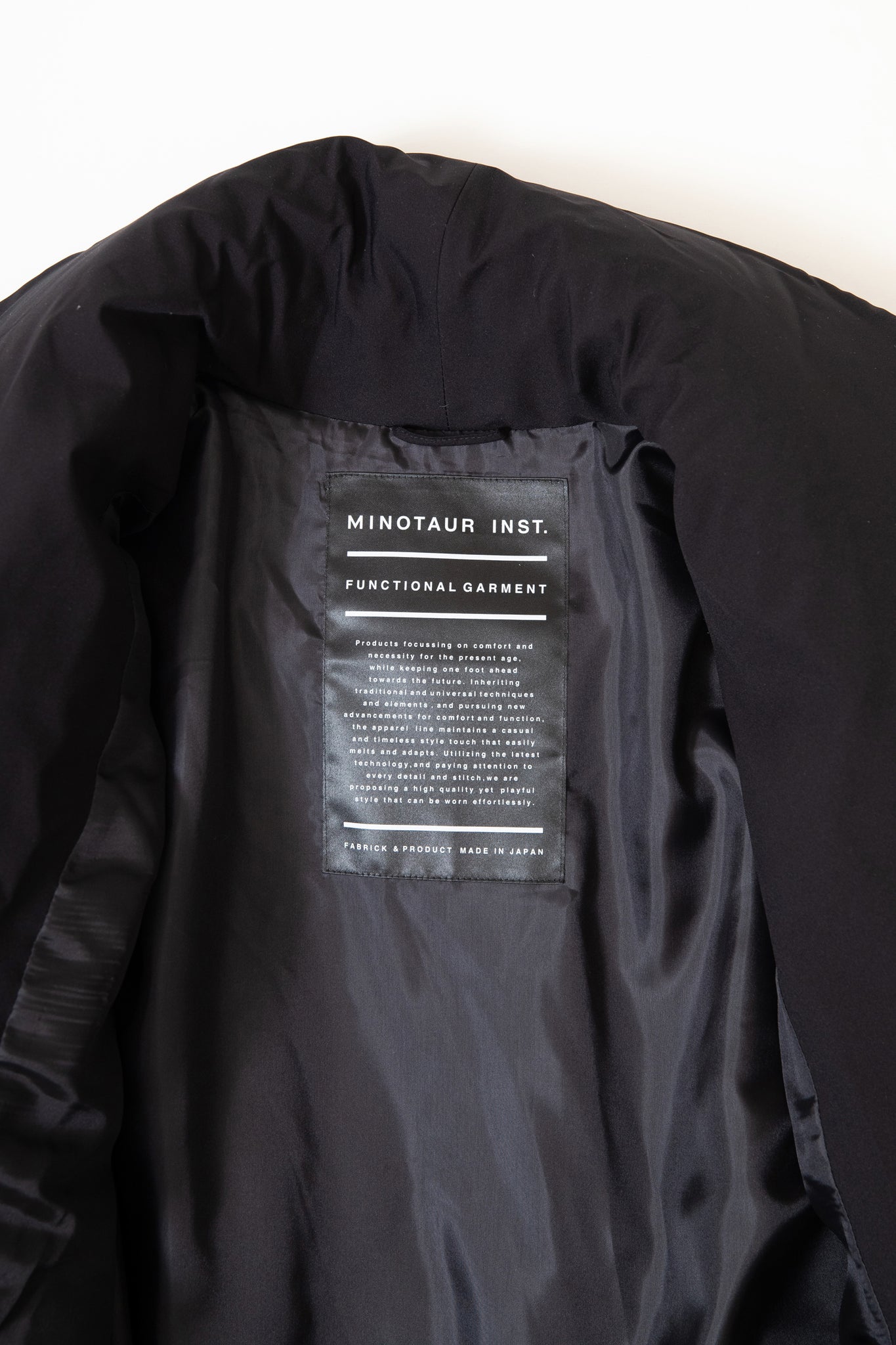A stretch material with durable water repellency and breathability, finished with a soft coating that preserves the original high-quality texture of the fabric.